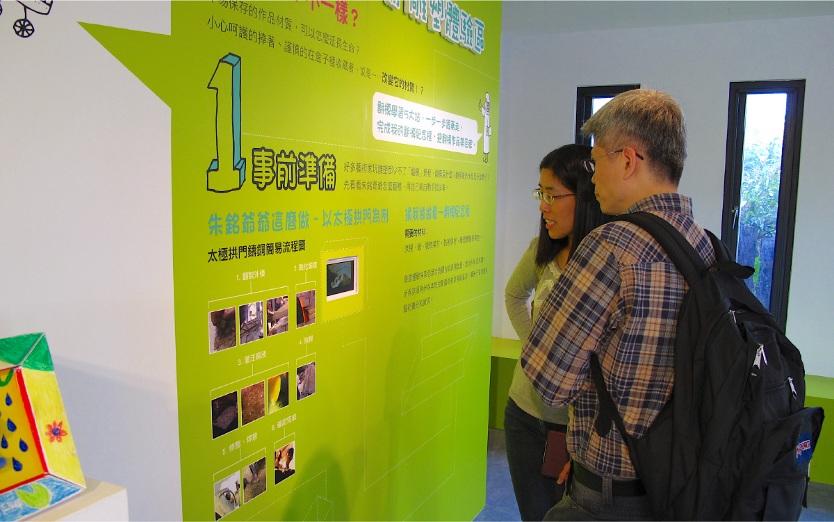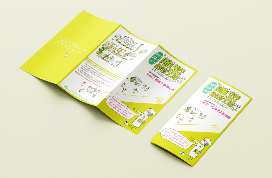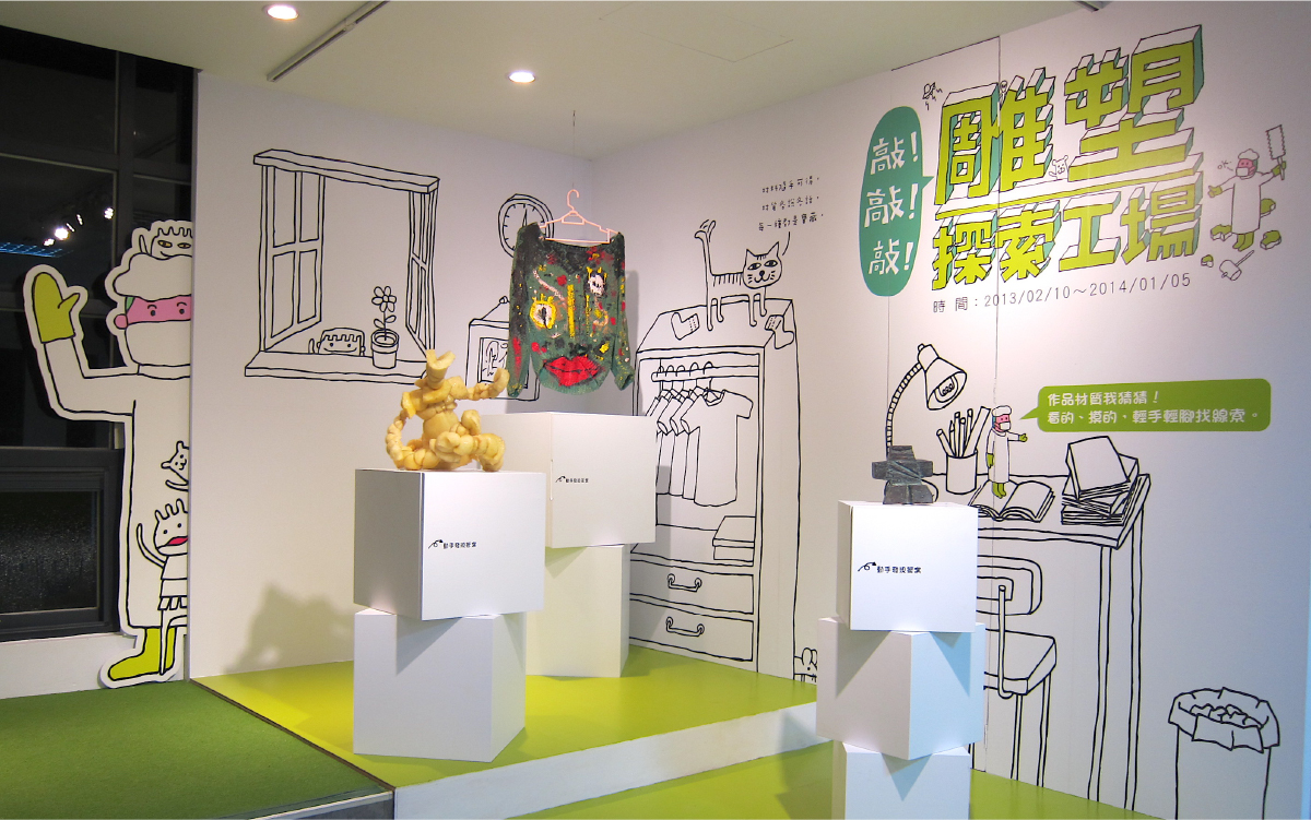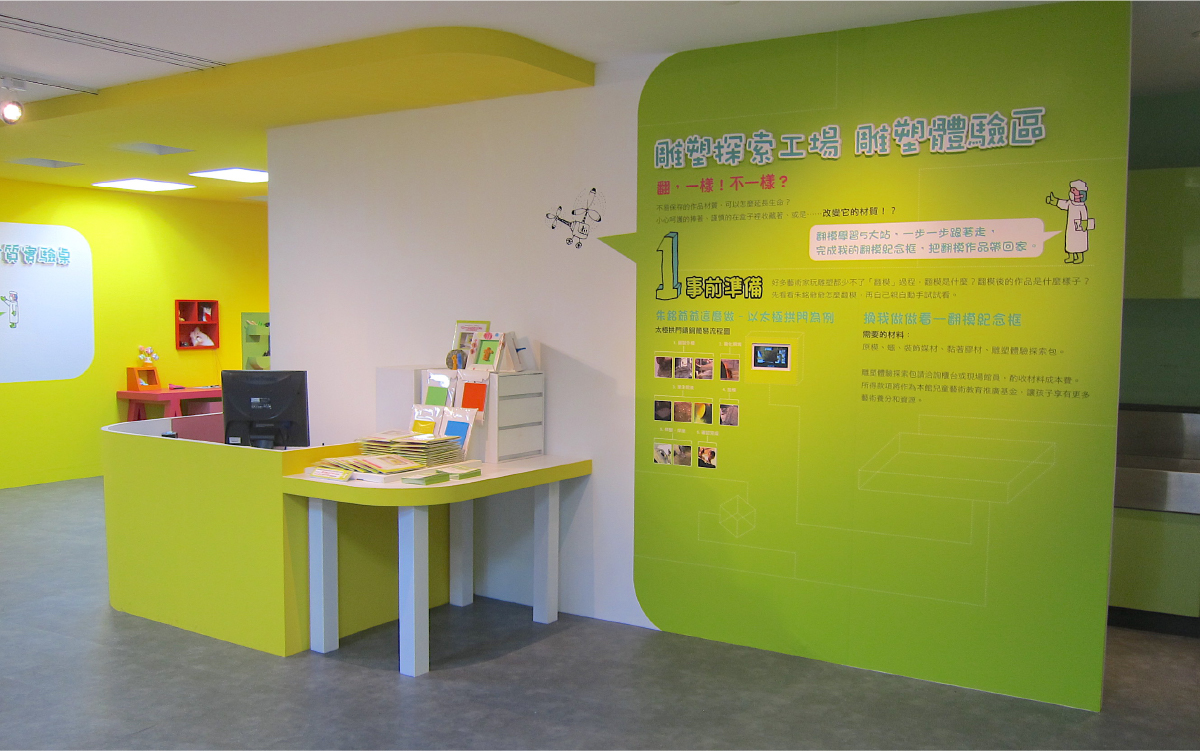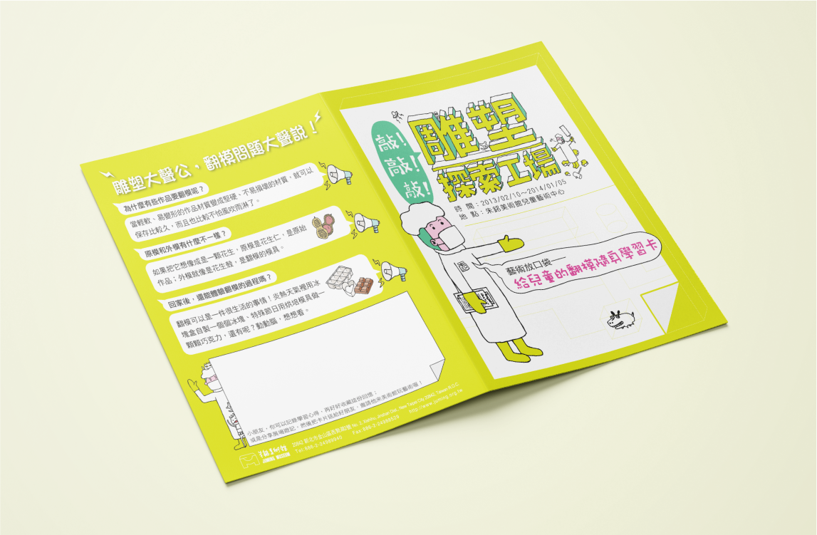 敲敲敲!雕塑探索工場 朱銘美術館大部分作品雖然看起來是很堅固的金屬材質,朱銘是用生活中常見的保麗龍、海綿翻銅製成的,還特意保留了原本材質的特色,讓作品更有趣了!這次教育展是介紹什麼是翻模,了解藝術家用不容易保存的材料做成作品後會利用「翻模」的方法,複製出一模一樣的作品,改變作品的材質。展場視覺設計用插畫繪製有趣和有想像力的簡易的翻模過程,還有雕塑工場裡的翻模小精靈帶領大家了解翻模複製與材質變換的趣味。 展場引導DM 兒童學習卡 DIY學習包使用說明書 展場規劃示意圖 展場照片